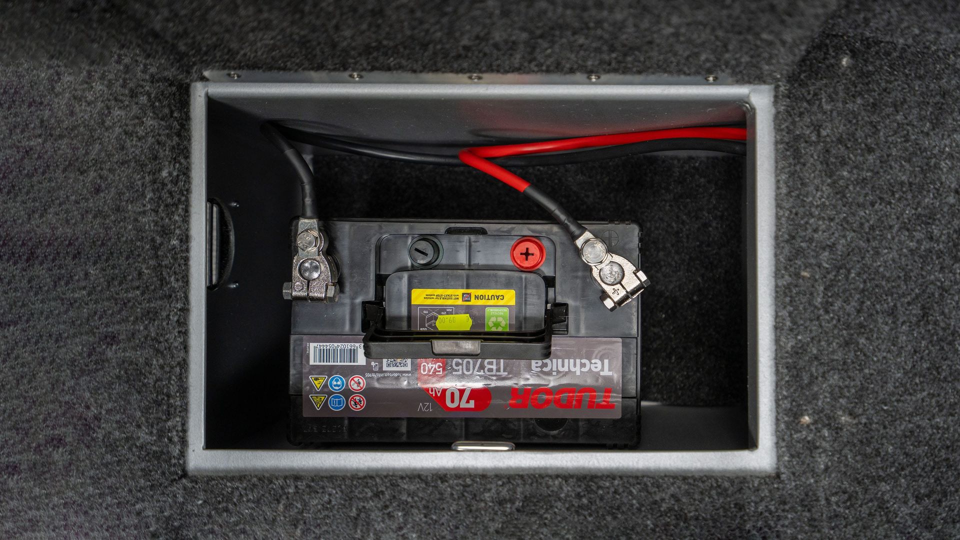 Meant for 10 spinning rods up to 2,7 m in length (unfolded). Im unteren Abteil sind zwei Batterien Elektromotoren verstaut.